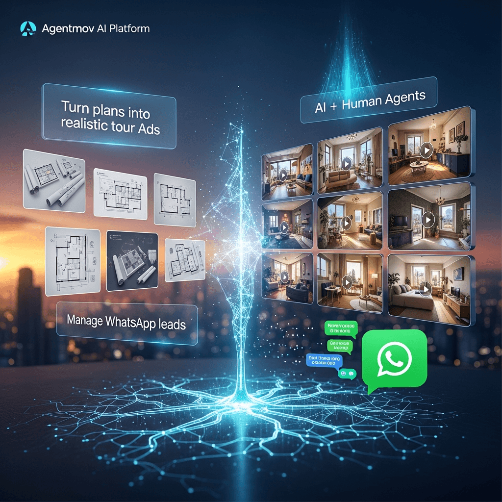 Upload a blueprint (or listing details). Agentmov generates an interactive tour, publishes marketing content, and runs WhatsApp/web conversations to qualify leads and schedule showings.